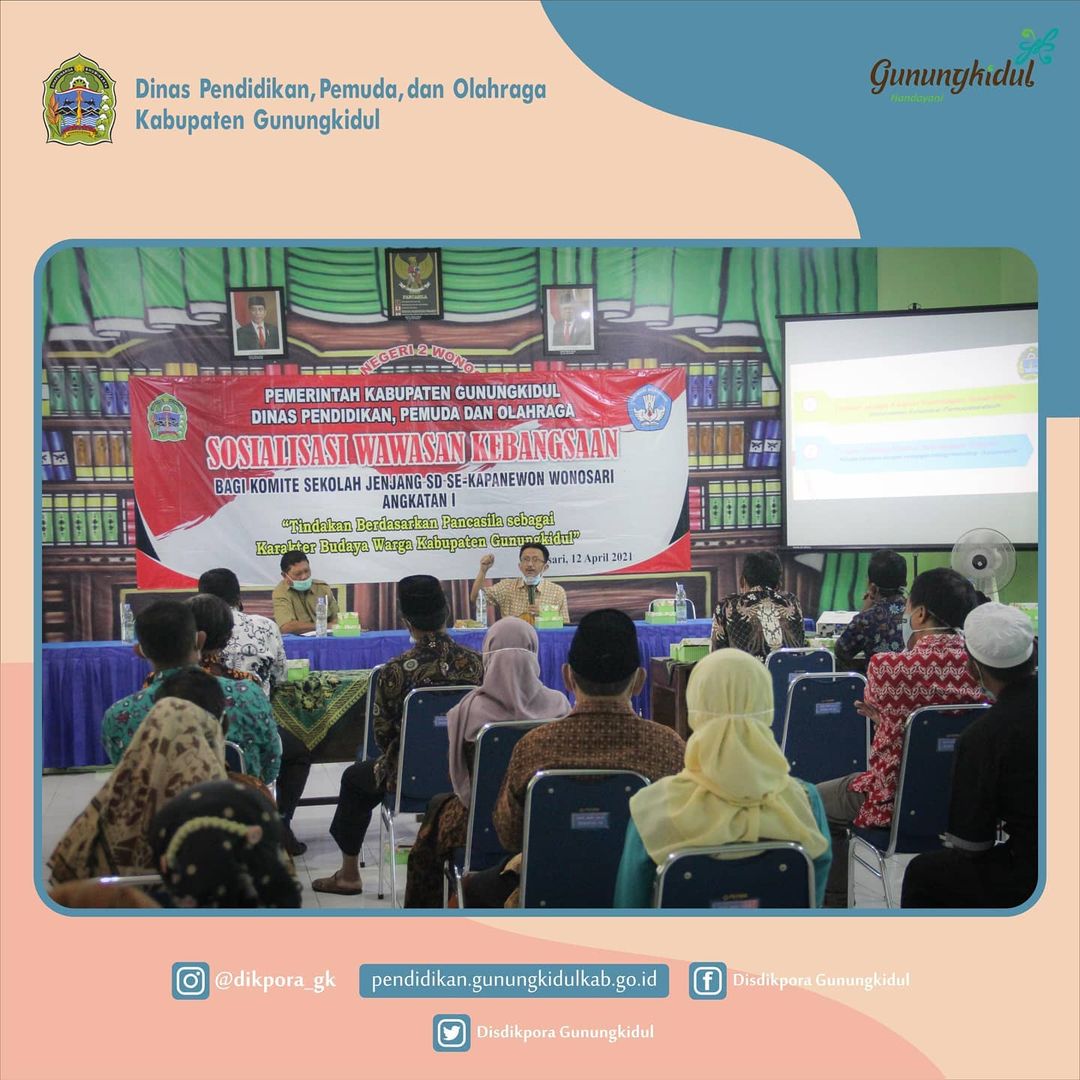 WONOSARI- Senin 12 April 2021 Subbagian Umum Dinas Pendidikan, Pemuda, dan Olahraga (Disdikpora) Kabupaten Gunungkidul menyelenggarakan Kegiatan Sosialisasi Wawasan Kebangsaan. Bertempat di SMP N Wonosari 2 Wonosari kegiatan dihadiri oleh Heri Nugroho, S.S. selaku Ketua Dewan Perwakilan Rakyat Daerah Kabupaten Gunungkidul dan Drs. Sudya Marsita, M.M. selaku Sekretaris Dinas Pendidikan, Pemuda, dan Olahraga Kabupaten Gunungkidul dengan peserta berasal dari Komite Sekolah Dasar (SD) Kapanewon Wonosari. Dalam sosialisasi tersebut Heri Nugroho, S.S. hadir sebagai narasumber Wawasan Kebangsaan dan Drs. Sudya Marsita, M.M. hadir sebagai narasumber Penyelenggaraan pendidikan di kabupaten Gunungkidul yakni membahas tentang Perda No. 06 tahun 2020.